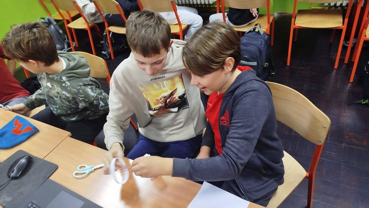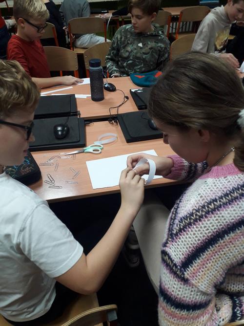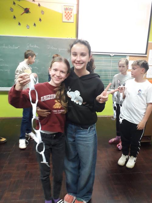 U drugom dijelu radionice učenici su sudjelovali u aktivnosti nazvanoj „Lanac suradnje”. Radili su u parovima s posebnim izazovom – svaki član para mogao je koristiti samo jednu ruku. Njihov zadatak bio je izraditi što duži lanac od papira i spajalica unutar ograničenog vremena. Ova aktivnost potaknula je učenike na kreativnost, učinkovitu suradnju te timski rad u ograničenim uvjetima. Kroz igru i međusobnu koordinaciju, učenici su uspješno savladali zadatak, istovremeno uživajući u procesu.