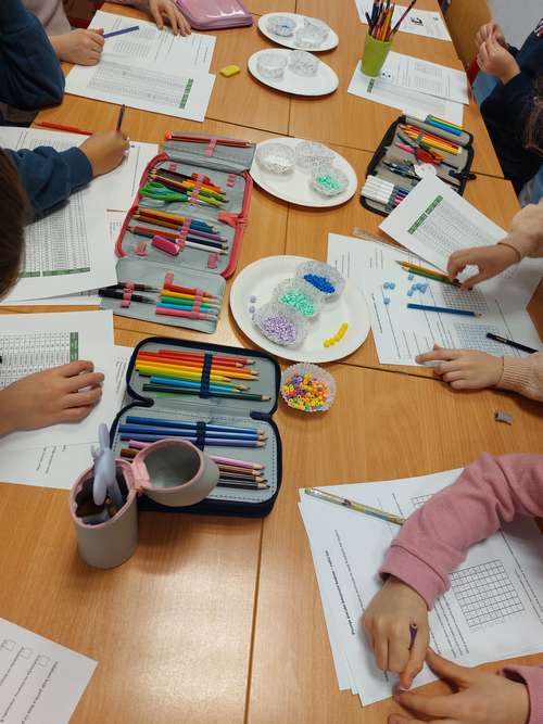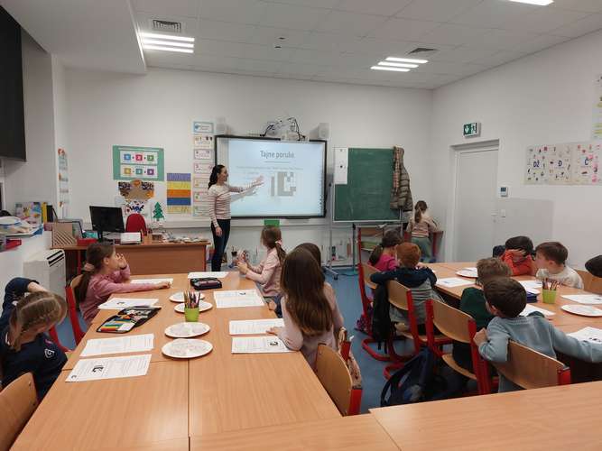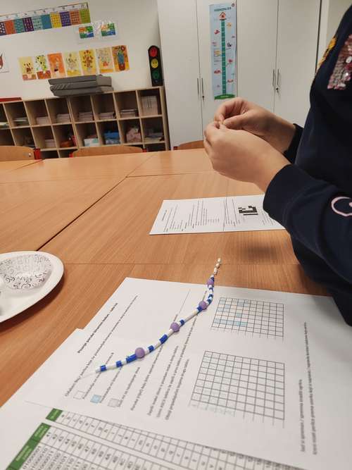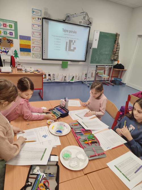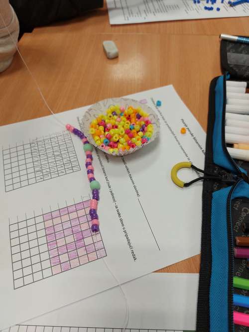 Učenici su se upoznali s binarnim jezikom računala te kako se znakovi i slike prikazuju u računalu. Svako slovo u abecedi se prikazuje binarnim kodom. Učenici su zapisivali slova odabranih riječi binarnim jezikom koji se sastoji od nula i jedinica. Pomoću kvadratne mreže stvorili su uzorak. Odabrali su boje perlica koje će predstavljati binarne znamenke nula i jedan te jednu koja je razdvajala svako slovo u riječi. Perlice su nizali na elastičnu vrpcu prema uzorku i time stvorili željenu tajnu poruku.