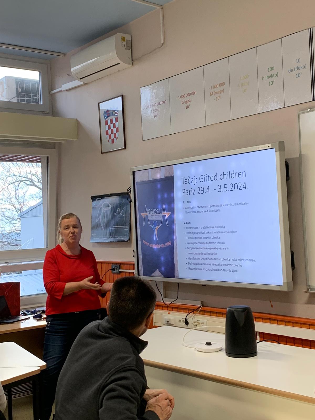 Učiteljica je predstavila projekt koji je financiran od Agencije za mobilnost i programe Europske unije. Glavni ciljevi projekta su edukacija djelatnika za rad s darovitim učenicima, povećanje kompetencija za prepoznavanje darovitosti te edukacija o metodama rada s nadarenim učenicima unutar redovne nastave.