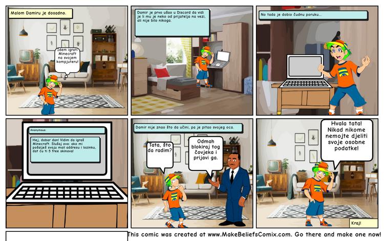Učenici 6. razreda sudjelovali su u radionici „Digitalna samoobrana“, u kojoj su kroz primjere iz svakodnevnog online života učili prepoznati najčešće digitalne prijetnje – od lažnih profila i phishing poruka do neprimjerenih zahtjeva i pokušaja krađe podataka. Razgovarali su o važnosti jakih lozinki, sigurnog dijeljenja informacija i pravilnog reagiranja kada se susretnu s neugodnim ili sumnjivim sadržajem. Na temelju naučenog osmislili su vlastite scenarije opasnih ili nezgodnih internetskih situacija te ih prikazali u obliku digitalnog stripa.